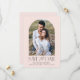 Announce your wedding date in style with our modern photo save the date. The simple save the date card features your engagement photo inside of a blush pink arch frame. "Save the Date" is displayed in black modern serif and script fonts. Personalise the front of the save the date by adding your names, wedding date, and wedding location. The card reverses to display a solid blush background.