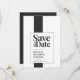 A beautiful strong serif font displays the future newlyweds' names and the date of the wedding, with wordings in a contrasting all capitals clean font within a modern geometrical frame in this minimalist typographical style wedding Save The Date. The reverse of the card features a solid dark grey colour and may be customised with the bride and groom's monograms in a beautiful white font.