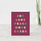 A modern, bold and colourful Christmas card in red and green with the words, "joy, love, peace, hope, cheer". The inside of the card has room for a photo and your own message.