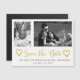 Modern faux gold glitter brush script fancy save the date wedding with 2 photos collage - one vertical / portrait orientated and the other horizontal / landscape. and two doddle hearts. ++++++++++++++ Personalise it with your photos, names and wedding date!