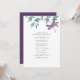 This simple modern garden greenery wedding invitation features a watercolor dragonfly in shades of purple and pink. It is resting on a simple arrangement of natural watercolor garden greenery in shades of green, blue, grey and brown with a white background. The back is a deep purple that matches the dragonfly.