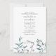 This simple modern garden greenery wedding invitation features a watercolor damselfly/dragonfly in shades of blue and green with iridescent wings. It is resting on a simple arrangement of natural watercolor garden greenery in shades of green, blue, grey and brown with a white background. The back is a solid grey that matches the text.