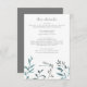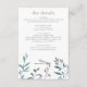 This simple modern garden greenery wedding Details enclosure card features a watercolor damselfly/dragonfly in shades of blue and green with iridescent wings. It is resting on a simple arrangement of natural watercolor garden greenery in shades of green, blue, grey and brown with a white background. The back is a solid grey that matches the text.