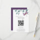 This simple modern garden greenery wedding RSVP card with QR code features a watercolor dragonfly in shades of purple and pink. It is resting on a simple arrangement of natural watercolor garden greenery on a white background. The back is a solid deep purple that matches the dragonfly. Just add your wedding website URL, so your guests can scan the QR Code and easily respond.