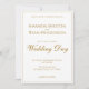 Modern and elegant wedding invitation. This simple modern wedding invitation is great to invite your wedding guests. The text is a golden modern script on a white background. You can easily customise all the text - personalise it with the bride`s name, groom`s name, date and time, location, and change or erase any text on the invite. The back side is in a golden colour.