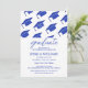 Minimalist graduation party invitations featuring falling blue mortarboard caps, and a modern text template that is easy to personalise. Personalise graduation party invite by adding the graduate's name, school name, and graduation year. The invite reverses to display your graduation party details with a white and blue background.