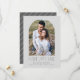 Announce your wedding date in style with our modern photo save the date. The simple save the date card features your engagement photo inside of a light grey arch frame. "Save the Date" is displayed in charcoal grey modern serif and script fonts. Personalise the front of the save the date by adding your names, wedding date, and wedding location. The card reverses to display a charcoal grey and white stripe pattern.