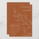 This elegant minimalist wedding invitation template, features line art leaf branches on a burnt orange background. The modern calligraphy script font pairs beautifully with a traditional serif font. A beautiful invitation for a fall wedding.