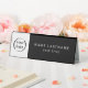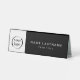 A modern professional table tent name sign for your desk ready to personalise with your logo, employee name and title or other text. Shown here with a sophisticated modern black and white background, you can change the colour by selecting "edit using design tool" which opens the full editor for changing the background colours and moving text.