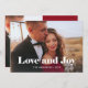 This simple and stylish holiday photo card says "Love and Joy" in bold, white elegant modern typography with your favorite personal family photo across the front of the card. Your personal holiday message can go on the back, with a minimalist red and white design.