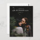 This minimalist modern photo wedding save the date postcard template has a simple, clean look with your names at the bottom in a script font. You might prefer another font style, script or otherwise, for your names or another part of the text. You can also change the size and colour of the text. Note however that when you edit this card to include your own information, some text fields such as the date and wedding location are the same for both front and back, so when you change this on one side, it will automatically change on the other side as well. This limits your ability to delete certain text or change the font, etc., as the change will take effect for that text field on both sides of the card, which you may not intend. Your names, however, can be edited separately on each side, as each side for the names has a distinct text field in the editing mode. Also be sure to notice and change the sample return address info to your own info, as it is rather small and is down at the bottom of the back of the card, easily overlooked! You can remove the lines for the addressee's information and/or the 'deliver to' text there if you want a simpler look.