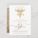 Celebrate your achievement in style with this modern nurse graduation party invitation, featuring a sleek design with a gold caduceus, and elegant gold script calligraphy initials monogram. The clean design adds a touch of sophistication. Gold and black type. Available in print, as a digital download, or both.