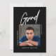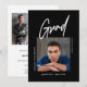 Celebrate your Graduate with this Photo Simple Modern Black Graduation Announcement Invitation designed in black and white, with a central photo and the word "Grad" in a modern script. This clean invitation is perfect for a male graduate like your son, graduating from college. Add two more photos on the back and personalise this template with the celebration details on the back of the card.