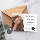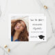 On front: Add your own vertical size photo of the graduate. A chic white background, black text. Templates for a name and date. The name and the text: Save the Date are written with a modern hand lettered style script. With a cap, tassel topper.