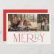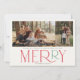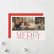 These simple holiday photo greeting cards feature the greeting, "Wishing you a Merry Christmas and a Happy New Year," along with the greeting, “Merry,” in large red and green letters on an ivory background with placeholders to add two of your favourite photos, family name & the year.