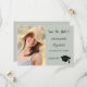 On front: Add your own vertical size photo of the graduate. A trendy muted sage green colored background, black text. Templates for a name and date. The name and the text: Save the Date are written with a modern hand lettered style script. With a cap, tassel topper.
