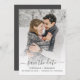 Spread the word of your upcoming wedding with these simple, modern photo save the date cards. The charcoal grey text reads "Save the Date" in elegant handwriting script with flourishes before and after. Replace the sample image with your favourite photo, and add your names along with the wedding date and location. A white gradient filter helps make the text pop.