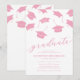 Minimalist graduation party invitations featuring falling pink mortarboard caps, and a modern text template that is easy to personalise.