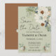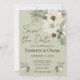 This beautiful wedding invitation design features white flowers, eucalyptus, and pine cones, against a rustic light sage green background. "Save the Date" is written across the top in large font. Customise the details to suit your needs and don't forget to change the initials in the back of the bride and groom!
