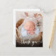 Modern Elegant Calligraphy Script Photo Newborn Baby Girl Thank You Postcard. Features a beautiful "thank you" text in a handwritten calligraphy swash tail font script white overlay. At the reverse side pre-made personal message in black and white. Great for baby girl or baby boy. Easy to personalise with your baby photo and details.