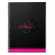 Simple modern script personalised notebook for your journalling. The elegant hot pink stylish script matches the line design in colour but offsets it in style, creating a fun twist to the minimalist look on black.
