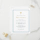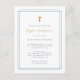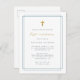 Simple first communion invitations featuring faux gold foil cross and calligraphy with a elegant modern typography on a white background with a blue border.