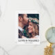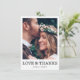 This elegant wedding thank you postcard has a photo in the front with Love and Thanks text overlay and the couple's names.