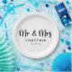 Modern minimalist script Mr and Mrs Paper Plates with shape and event date, simple and elegant. Great for modern wedding or events. See all the matching pieces in collection.