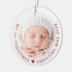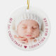 This elegant baby's first Christmas holiday ornament for new for new parents features a baby photo in the center with circular red typography that reads "My 1st Christmas (name) 20XX" to personalize. The back of the ornament has the word "Joy" in a modern hand lettered red script.. From our hearts to yours Happy Holidays!