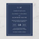 Simple budget wedding invitation featuring a modern yet elegant design with your two letter monogram at the top, a bold date layout and your details surrounded by a thin border. All design elements are in white over a navy blue background and may be changed in the design editing tool. A chic and stylish design that is great for a minimalist couple.