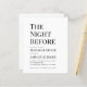 A simple, minimalist black and white rehearsal dinner invitation. It has just black text on white background. The title "The Night Before", the occasion "Rehearsal Dinner" and the name are written in larger caps, the rest in small caps. The text is left aligned.