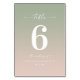 Simple Ombre Leaf Green & Light Pink Wedding Reception Dinner Table Numbers. This modern chic Table Card is simple classic and elegant with a subtle ombre gradient fade and a pretty signature script calligraphy font with tails. Shown in the new Colorway. Available in several colour options, or feel free to edit the colours from within the editor (click customise further while personalising).