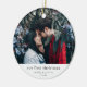 Simple Our First Christmas Engaged Couple Photo Ceramic Ornament is a stylish modern holiday ornament with your names featured in classic typography in white over your full size photograph.