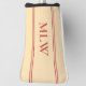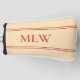 Three red letters are in the centre. You can change the letters to display the correct monogram. Two red horizontal lines are above and below the initials. The background is peach.