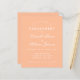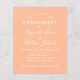 A simple engagement party invitation with a modern colour: peach. It has only white text on peach background. The names are written in an elegant calligraphic script, the rest in caps. the first line is arched text.