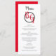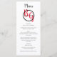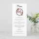 This design features an elegant yet simple arrangement of the bride's and groom's personalised initials. The couples names are encircled with a black ring and placed on top of the bride's and groom's first name initials which are displayed in red colour typography. This red, black and white design is simple yet elegant in every way. The combination of colours creates a sophisticated, trendy and chic style. Elegant wedding menu card design with modern elements. The simple setup of the typography gives it a distinct style. Matching wedding invitations and other stationery items are also available.