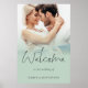 Available printed or as a printable digital download. Simple Photo Overlay Modern Script Welcome to Wedding Sage Green. Modern minimalist style to greet your guests in a soft pastel sage green. Simply replace the sample photo with your own which is behind a graduated tinted layer where the text is partially overlaid onto it.  Welcome is in a stylish set script and the rest of the text you can easily personalise.