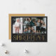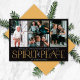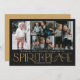 These simple holiday photo greeting cards feature the greeting, "Wishing you a Merry Christmas and a Happy New Year," along with the greeting, “Spirit of Peace,” in large ivory and gold letters on an black background with placeholders to add four of your favourite photos, family name & the year.