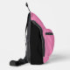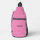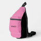 This pink crossbody sling bag has text in black script. The text can be edited or deleted.