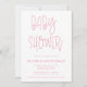 A simple pink and white baby shower invitation with "baby shower" in large pink handwriting font, on a white background. The reverse is in baby pink with white stripes.