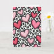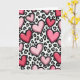 This greeting card features a repeating pattern of pink hearts layered over a black-and-gray leopard print on a white background. The hearts come in different sizes and shades, from soft blush to deep fuchsia, and each one has a thick black outline. A few hearts overlap and tilt in different directions, which makes the design feel lively and full of energy. Small white highlights on the hearts give them a slightly shiny, rounded look, like they’re catching the light. The leopard spots underneath add a fun contrast that keeps the card from feeling too sweet, balancing romance with a bit of attitude ❤️. There isn’t any text on the front, so the pattern does all the talking and leaves room for your own words inside. It feels meaningful to give because it says “I care about you” in a confident, modern way without needing a long message 🥰.