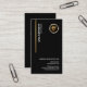 A simple creative design. In an all black background, a vertical faux gold line comes through from the top. Alongside it, is your prestigious name and job title. Eastwards of this is your optional logo. Directly below near the base of the card, are the business name and contact details.