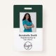 Standard forest green employee ID badge with name, title, ID number or other info and your logo below your photo. The back has your contact info and bar code or QR code. This professional design is great for a small business, hospital or any corporate business.
