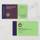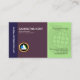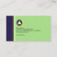 Design features a blue rectangle at the left which houses the inverted Business Name ; This is to add uniqueness to the design. The next purple piece has your prestigious name and job title. Directly underneath this, is the faux gold logo. The light green column on the right has an embedded global imprint on it. A slogan tagline sits at the top whilst near the base are the contact details.