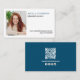 A simple design features a QR code business card template, with a simple photo, and a modern professional style, with a scannable barcode for a website or social media such as Instagram and Facebook, a minimalist, trendy chic design, with minimal contact details, and a blue clean-lined background on the back, a photography picture text overlay business card.