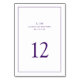 Simple wedding table number featuring an elegant and timeless design with your two letter monogram, names, date and table number surrounded a thin border. All design elements are royal purple over a white background and may be changed to any colour you wish in the design editing tool. A clean and classic design perfect for a couple who wants a traditional style table number with a modern touch. Add each table number to your cart individually.