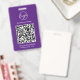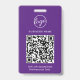 Custom ID name badge in a vertical layout with your logo and QR code. Use the template to add each employee name and title. The backside has your contact information and instructions for returning if found. This simple yet professional design features all text in white over a royal purple background and may be changed to any colour you wish by clicking the "customise" button. This corporate style ID badge may be personalised for any type of business big or small.