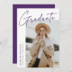 Modern graduation announcement card featuring one of the graduate's photos on the front with "Graduate" in a purple handwritten script with a white background. Personalise with the graduate's name, school name, and graduation year. The minimalist graduation announcement reverses to display 4 photos in a grid-style layout with the graduate's future plans or other custom text shown below. The 5 photo graduation announcement is perfect for both high school and college graduates.