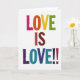 This card features the message “LOVE IS LOVE!!” centered on a white background, stacked in three lines from top to bottom. The letters look slightly uneven, like they were cut and placed by hand, which makes the message feel human and real. The top line, “LOVE,” uses fuchsia, orange, yellow, and green letters that feel bright and happy. In the middle, “IS” is done in red and deep maroon, adding a steady, warm note. The bottom line, “LOVE!!” mixes purple, teal, indigo, and cyan, followed by two exclamation marks in black and magenta. The text is in big, simple printed letters, and the strong contrast against the white space makes it easy to read right away. It’s a meaningful card to give because it supports love in all forms and says “I’m with you” in a clear, caring way 🥰❤️.