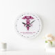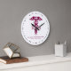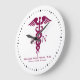 A clock with a stylish red caduceus symbol with the letters R N on either side. Simple minimalist design.